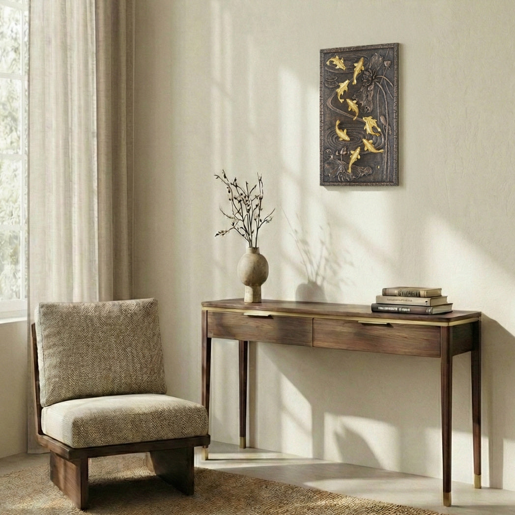 The carp is synonymous with good fortune, bringing in stability and success. Fully handcrafted, this auspicious piece features nine carps in a lotus pond, encapsulated in 24K Swiss Gold and mounted onto a copper blackening frame, swimming in abundance. The Chinese word for Nine (九 Jiu) is homophonous with the word (久 Jiu), symbolizing longevity and prestige, while the Lotus is a symbol of purity, enlightenment, and rebirth. A treasured addition to your workspace or to a business associate.